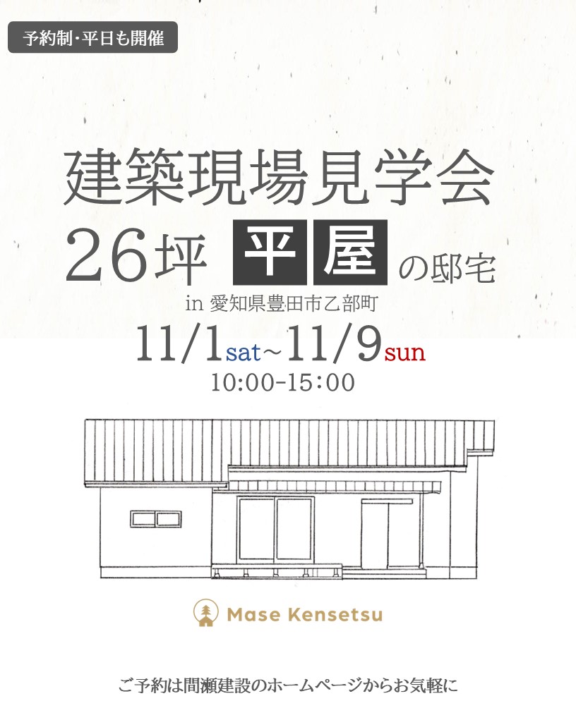 愛知県豊田市を中心に和モダンの注文住宅の新築、リフォームをを手掛ける間瀬建設です。間瀬建設では11月1日~9日までの平日・祝日含む9日間、豊田市乙部町にて26坪の平屋のおうちの建築中の現場が見られる「建築現場見学会」を予約制にて開催します。新築にしてもリフォームにしても「おうちの中」を知ることによって家づくりで気を付けておかないといけないポイントが見えてきます。これからおうちづくりを計画される方は、間瀬建設で家を建てるかどうかは置いておいて、一度今後の家づくりの参考に今回の現場見学会にご参加ください。きっとあなたの家づくりのヒントに繋がるはずですよ。営業マンがいない住宅会社になります。しつこい営業も一切ありませんので、お気軽にお越しください。